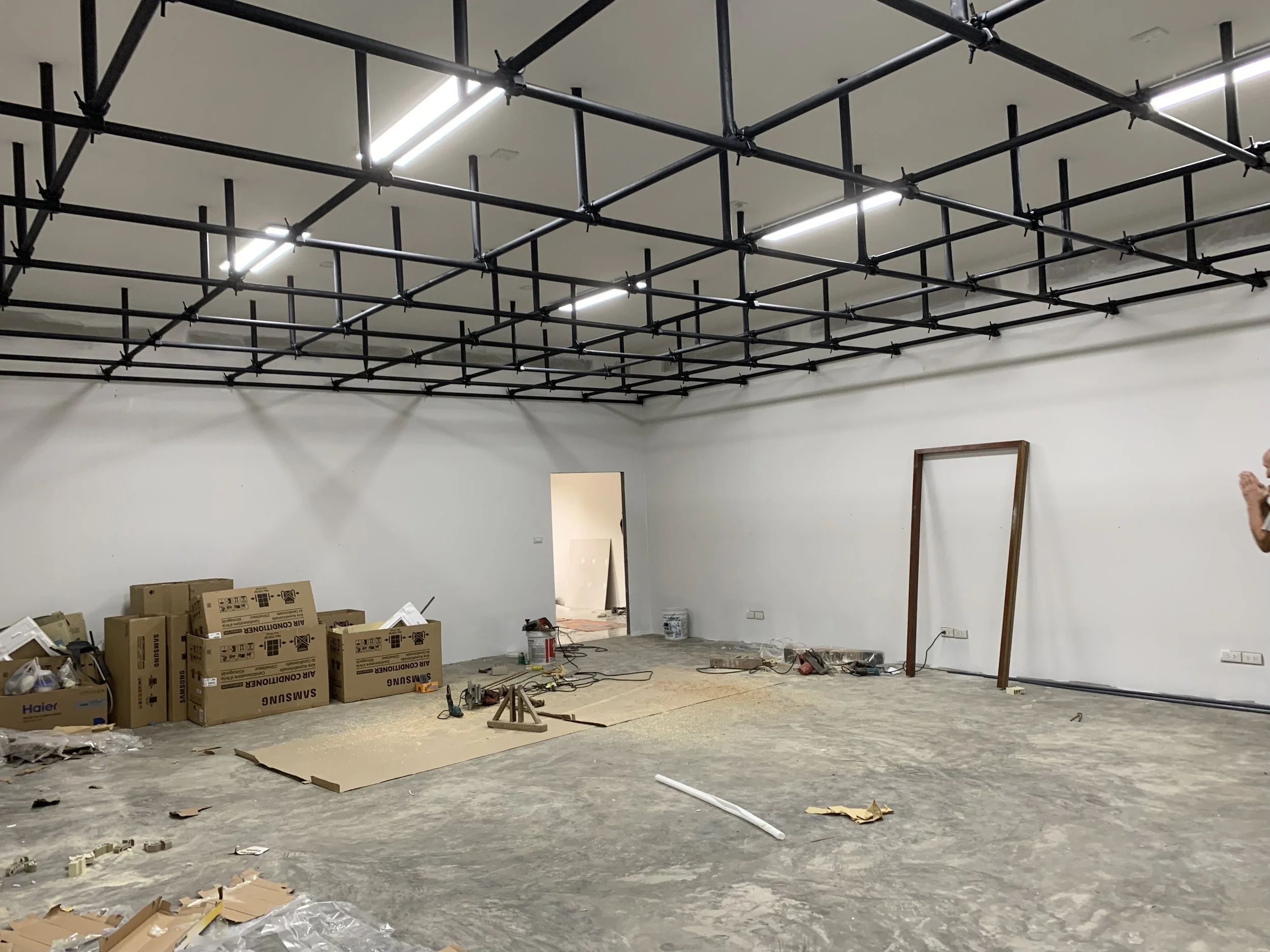 The new studio, with the lighting grid hung from the ceiling