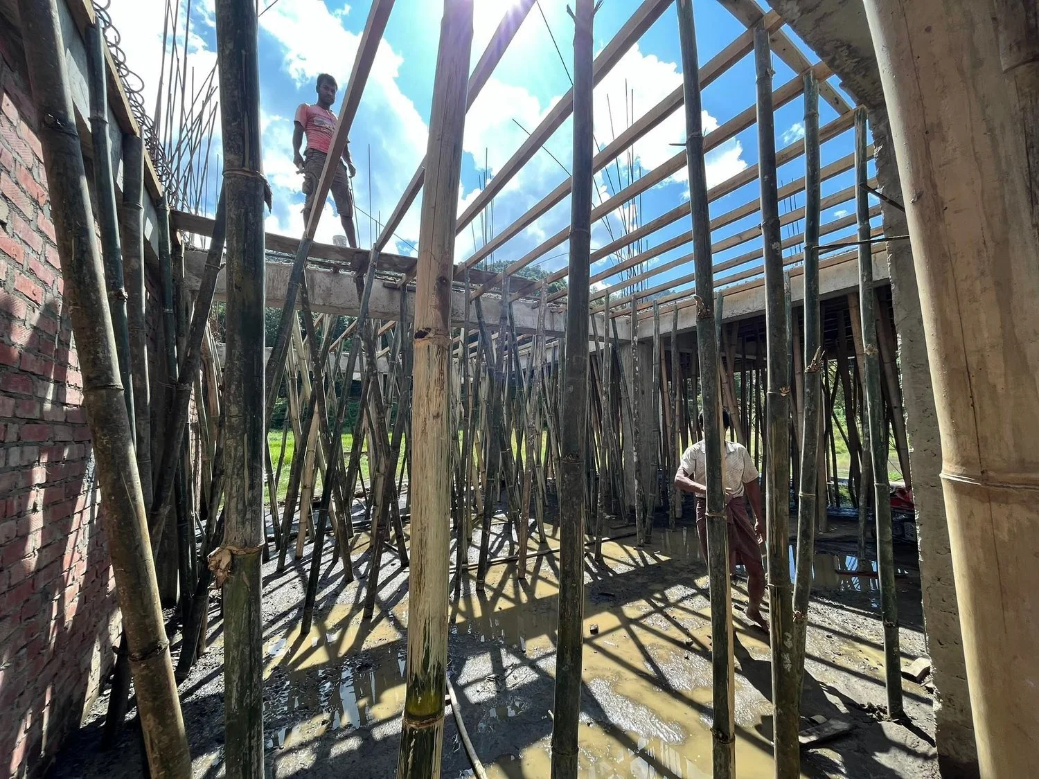 They have installed crossbeams and bamboo poles to support boards, which they will pour concrete over.