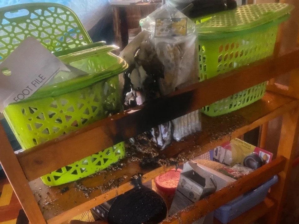 She looked around and saw smoke coming from her room, and the wall was burning. When Billy had turned on the air compressor to fill the bicycle tire, the thin wires connecting it to the power source got too hot. An extension cord inside the house sparked and started the fire. She called out to Billy and Alysa, and they put the fire out by beating it with clothes. Some items on a nearby shelf got burned, but nothing compared with what could have happened.